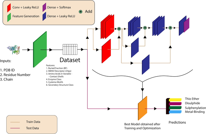 Workflow and architecture of DeepCysCysteine (Cys) is the most reactive amino acid participating in a wide range of biological functions. In‐silico predictions complement the experiments to meet the need of functional characterization. Multiple Cys function prediction algorithm is scarce, in contrast to specific function prediction algorithms. Here we present a deep neural network‐based multiple Cys function prediction, available on web‐server (DeepCys) (https://deepcys.herokuapp.com/). DeepCys model was trained and tested on two independent datasets curated from protein crystal structures. This prediction method requires three inputs, namely, PDB identifier (ID), chain ID and residue ID for a given Cys and outputs the probabilities of four cysteine functions, namely, disulphide, metal‐binding, thioether and sulphenylation and predicts the most probable Cys function. The algorithm exploits the local and global protein properties, like, sequence and secondary structure motifs, buried fractions, microenvironments and protein/enzyme class. DeepCys outperformed most of the multiple and specific Cys function algorithms. This method can predict maximum number of cysteine functions. Moreover, for the first time, explicitly predicts thioether function. This tool was used to elucidate the cysteine functions on domains of unknown functions belonging to cytochrome C oxidase subunit‐II like transmembrane domains. Apart from the web‐server, a standalone program is also available on GitHub (https://github.com/vam-sin/deepcys).